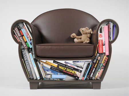 När utrymmet tar slut kan man förvara böcker i möblerna På Bokmässans Facebook hittar jag denna fåtölj. Den ser varken snygg eller skön ut, men kul!